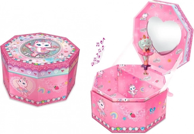 La boîte à bijoux musicale octogonale ornée d’un chat ballerine fera plaisir à chaque enfant. À l’ouverture, la figurine se met à tourner et une mélodie classique retentit. La boîte comprend un miroir, un espace pour les petits objets et fonctionne avec un mécanisme à remontoir sans piles.