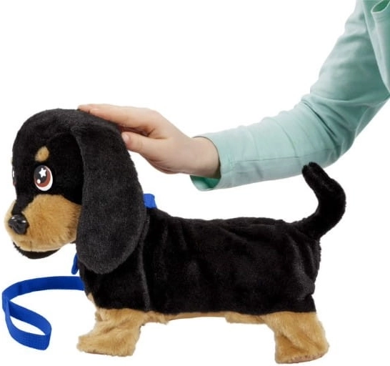 Le mignon teckel en peluche ANIMAGIC Waggles est le premier « petit compagnon » idéal pour les enfants dès 3 ans. Il sait marcher en laisse, remuer la queue, aboyer et réagit aux caresses sur la tête. Il a une fourrure douce et soyeuse et une laisse bleue avec médaille d’identification – prêt pour les promenades et les moments câlins.