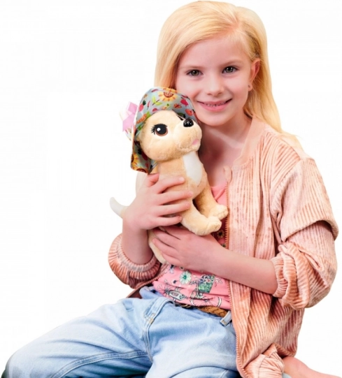 Chien Chihuahua en peluche avec de grands yeux expressifs et un chapeau coloré, parfait pour câliner.