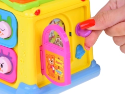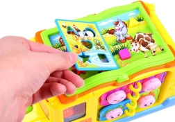 Boutons de différentes formes et couleurs, rouleau rotatif avec animaux, roues dentées avec manivelle, petite porte avec sonnette, clé arrière pour changer les images