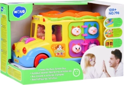 Un bus interactif coloré et ludique en plastique de qualité offre aux enfants beaucoup de divertissement et d'apprentissage. Il peut se déplacer tout seul, jouer des mélodies, s'illuminer et réagir aux obstacles. Sur le toit, un petit livre avec des boutons de différentes formes et couleurs déclenche des sons d’animaux, le klaxon, le démarrage du moteur et des mélodies. Sur les côtés, vous trouverez des engrenages avec une manivelle et des « petites bouilles » expressives. Idéal pour développer la motricité fine, la reconnaissance des formes et des couleurs et la perception des sons.