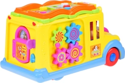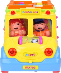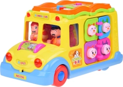 Le bus scolaire interactif séduit par ses couleurs vives, sa finition soignée et ses nombreuses fonctions. En roulant, il joue de la musique joyeuse et fait clignoter ses phares. Lorsqu’il heurte un obstacle, il change automatiquement de direction, mais peut aussi être contrôlé manuellement. Le rouleau avant rotatif avec des animaux déclenche des rires d’enfant et de courtes mélodies lorsqu’on le tourne. Sur le toit se trouve un livret coloré avec des boutons – chaque bouton active des sons d’animaux, le klaxon, le démarrage du moteur ou des mélodies.