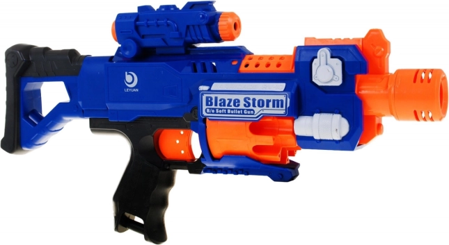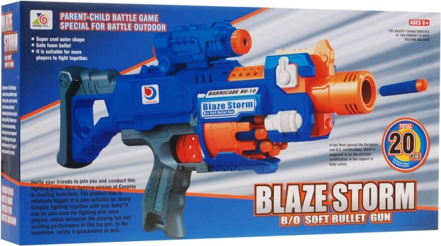 Profitez d’un jeu d’action avec le pistolet blaster électrique pour enfants BLAZE STORM, qui tire de doux projectiles en mousse. Il offre un déclenchement entièrement automatique, une cadence de tir rapide jusqu’à 3 tirs par seconde, une portée d’environ 10 m et une crosse amovible pour le transformer en pistolet compact. Inclus: accessoire optique et 20 longs projectiles en mousse pour un jeu sûr et amusant dès 8 ans.