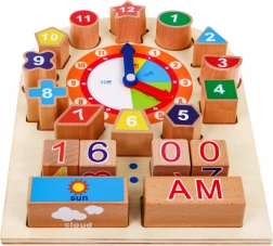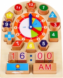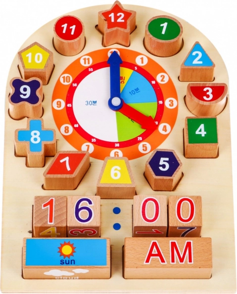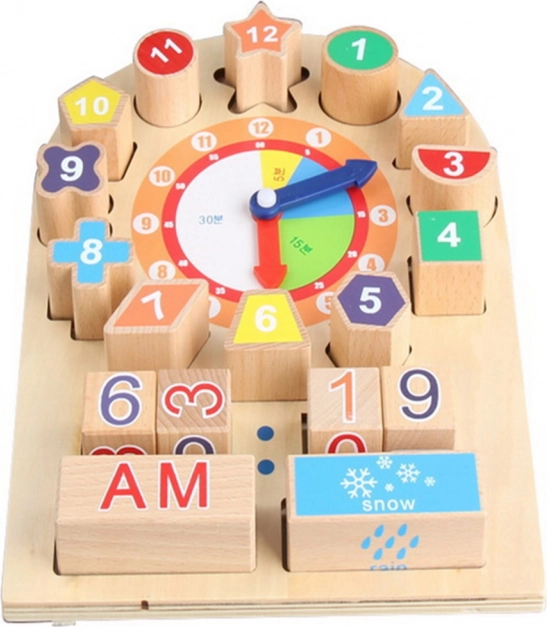 Ce set d’horloge en bois aide votre enfant à apprendre facilement à reconnaître l’heure, le moment de la journée, la météo et les mois. Il comprend deux aiguilles mobiles pouvant être librement réglées pour différentes heures. L’enfant peut immédiatement indiquer l’heure à l’aide de blocs numérotés et aussi reconnaître le moment de la journée, s’il fait soleil, s’il est nuageux, s’il pleut ou s’il neige. Les blocs numérotés ont des formes variées qu’il faut correctement placer sur le tableau.
