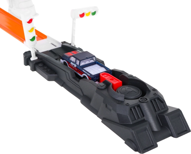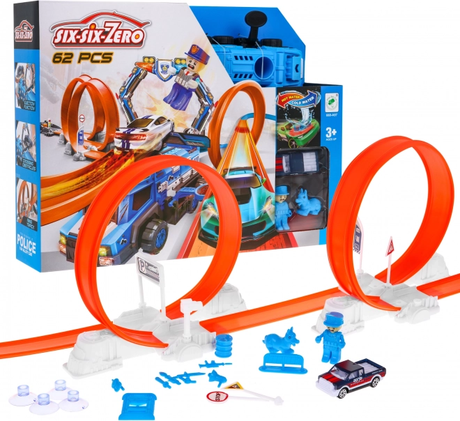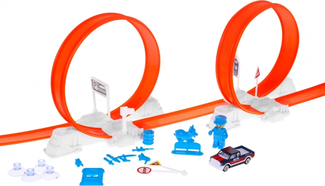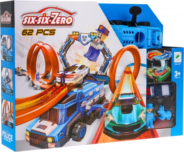 Construisez votre propre piste d’adrénaline sur le thème de la police et envoyez les petites voitures dans deux grands loopings avec rotation complète à 360°. Le lanceur puissant garantit la vitesse nécessaire et le grand camion de police devient le centre de chaque poursuite. La voiture spéciale change de couleur une fois mouillée, pour des effets et des histoires renouvelés à chaque course.