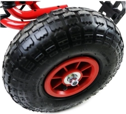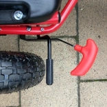 Grâce aux larges pneus gonflables à profil marqué, le kart maîtrise pavés, jardin et allées de parc. Le frein à main agissant sur les deux roues arrière apporte de l’assurance en descente, tandis que la chaîne carénée et les pédales antidérapantes renforcent la sécurité. Une peinture de qualité protège la surface contre les rayures et les intempéries.