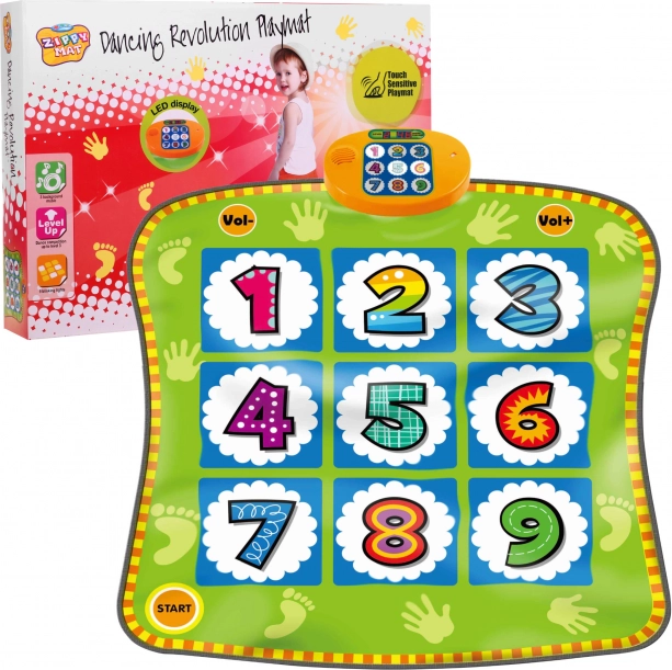 Le grand panneau couleur avec écran sélectionne aléatoirement les chiffres 1–9 et accompagne le jeu de sons. Choisissez parmi 3 niveaux de difficulté, réglez le volume (VOL-/VOL+) et laissez les enfants s’amuser en toute sécurité à la maison. Pour économiser l’énergie, le tapis s’éteint automatiquement après 2 minutes d’inactivité.