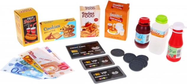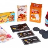 L’ensemble comprend également des aliments factices comme du ketchup, du jus, du lait et diverses boîtes en carton, enrichissant le jeu et l’imagination des enfants.