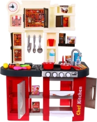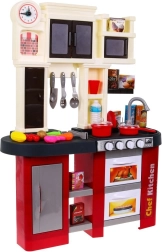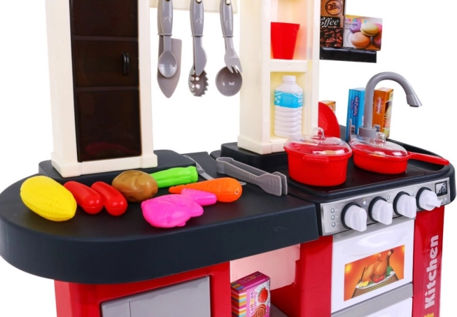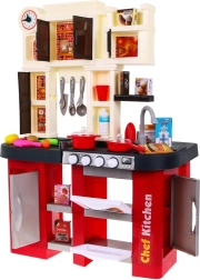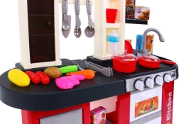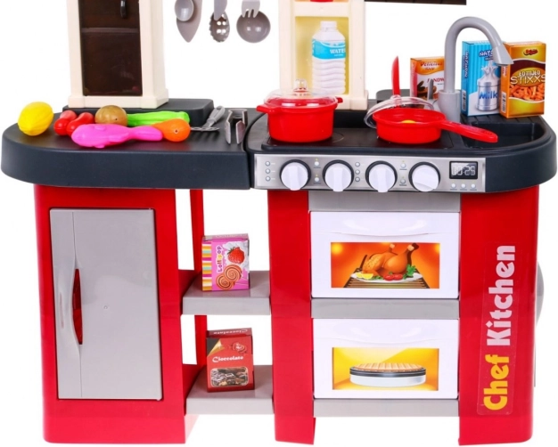 Cette grande cuisine en plastique au design rouge et noir offre aux enfants dès 3 ans une expérience de cuisine authentique. De véritables effets lumineux et des sons de cuisson et de friture se déclenchent en tournant les boutons, favorisant le jeu créatif et le développement de la motricité. Elle inclut également un robinet fonctionnel, pour encore plus de plaisir.