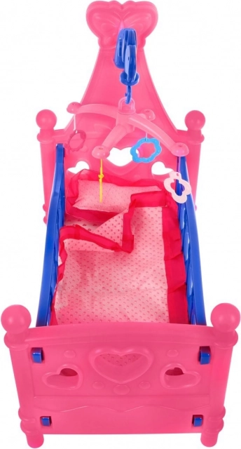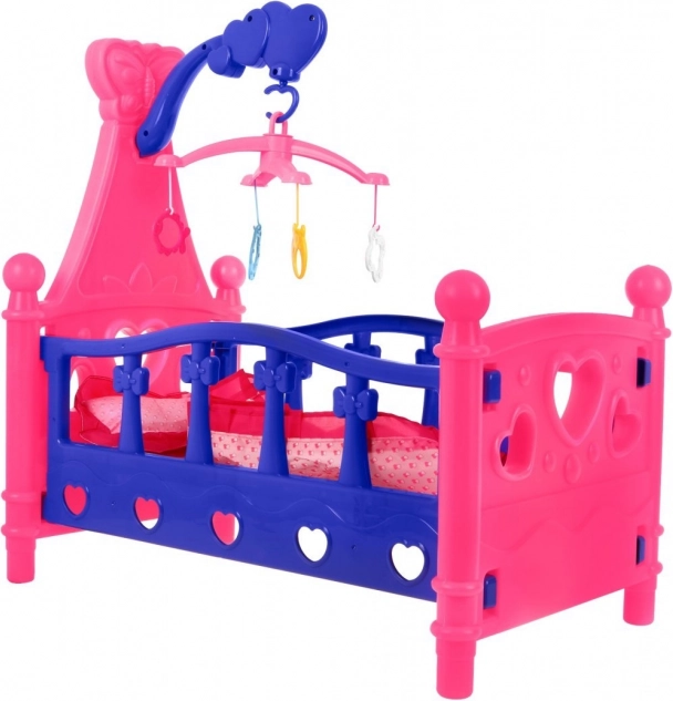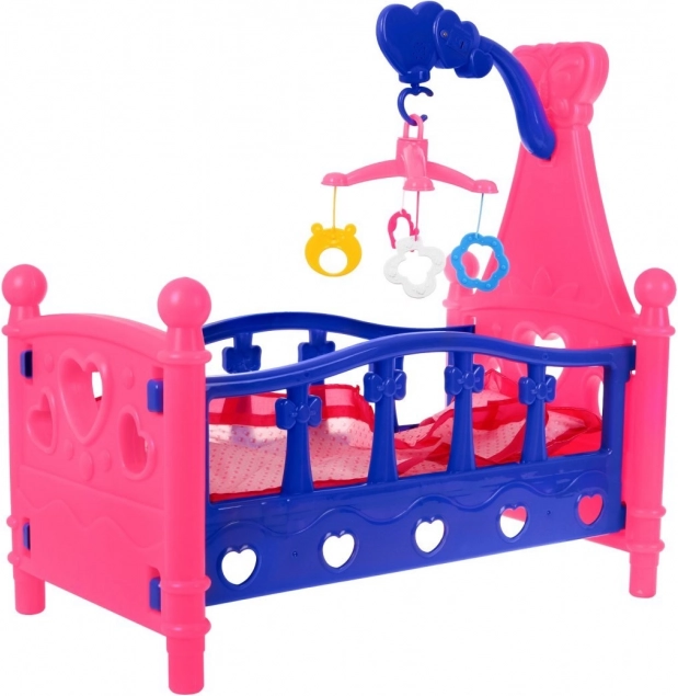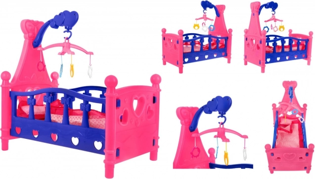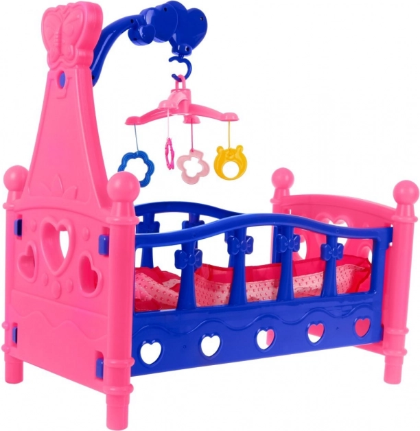 Ce lit pour poupées est un excellent complément à toute chambre d’enfant. Il se distingue par sa combinaison joyeuse rose-bleu, ses découpes en forme de cœur et son mobile fonctionnel avec pendentifs colorés. Un matelas en tissu, un coussin et une couette sont également inclus pour que la poupée préférée puisse dormir confortablement.