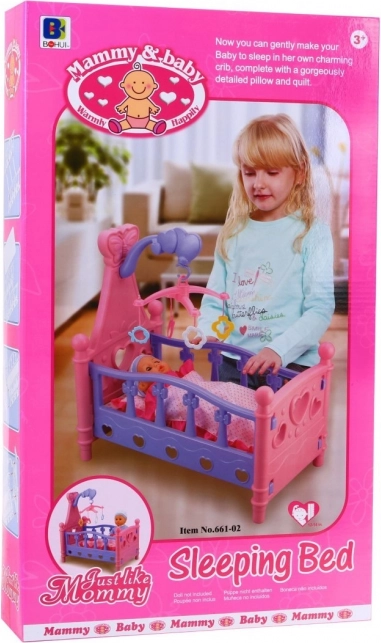 - Lit, mobile avec jouets, coussin, couverture, matelas en tissu