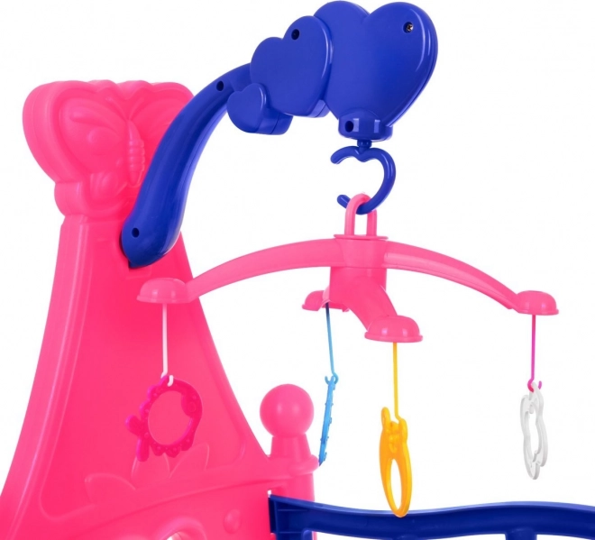 Le mobile rotatif avec jouets suspendus attire l’attention et enrichit le jeu d’imitation autour des soins à la poupée.