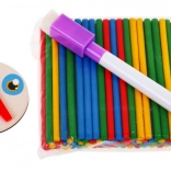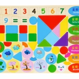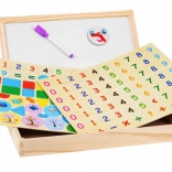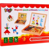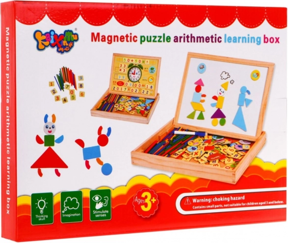 Une boîte pratique en bois sert de rangement pour tous les accessoires et, sur sa face inférieure, vous trouverez une table de multiplication pour vérifier rapidement les résultats. Grâce aux cartes et aux instructions incluses, les enfants peuvent composer des images à partir de formes magnétiques et développer ainsi leur créativité et leur motricité fine.
