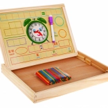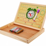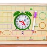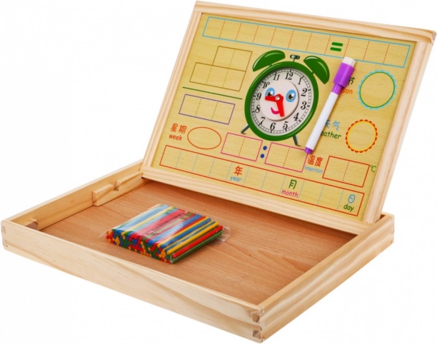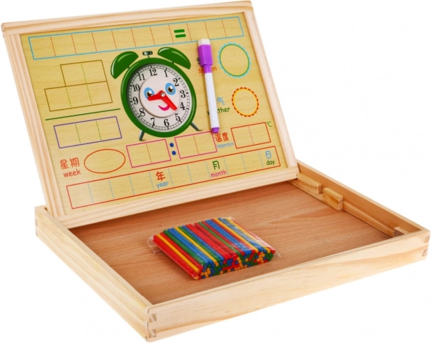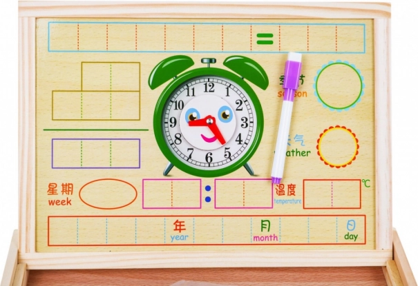 Ce set en bois de qualité est conçu pour offrir aux enfants une grande variété d’activités d’apprentissage et de divertissement. Il les aide à se familiariser avec les chiffres, l’addition, la soustraction, la multiplication et la division, à apprendre à se repérer dans le temps grâce à l’horloge magnétique et à reconnaître les formes, les jours de la semaine, la météo et les saisons. La table magnétique double-face et le feutre effaçable favorisent des exercices répétés sans désordre.