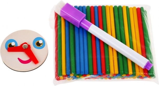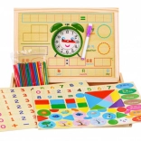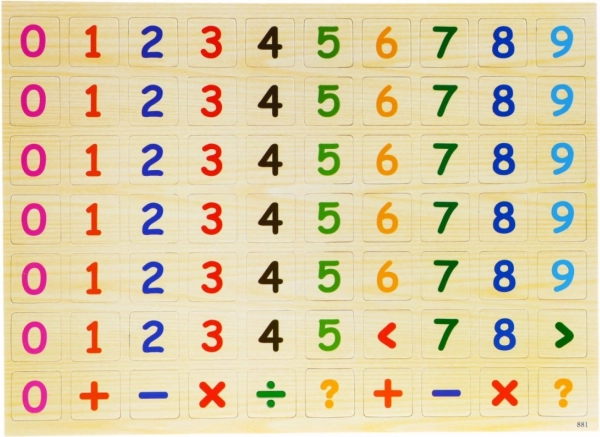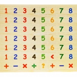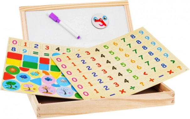 - Boîte en bois avec table de multiplication au verso ; cartes magnétiques avec chiffres ; cartes magnétiques avec signes (+, −, ×, ÷, >, <, =, ?) ; formes magnétiques colorées ; pastilles magnétiques météo, saisons et jours de la semaine ; horloge magnétique ; tableau magnétique double-face ; bâtonnets de comptage en bois colorés ; guide illustré ; feutre effaçable avec aimant