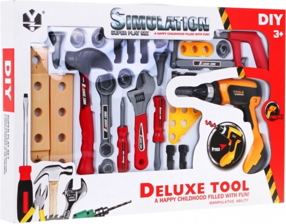 - 26 pièces incluant perceuse, clés, marteau, scie, tournevis et éléments de liaison