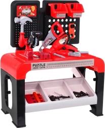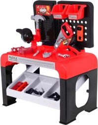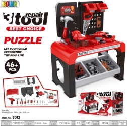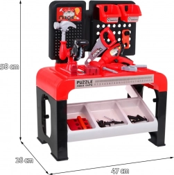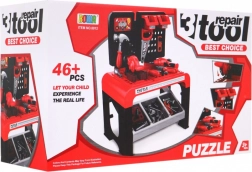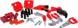 Le set comprend 46 éléments dont une perceuse manuelle, un tournevis avec embouts interchangeables, des scies manuelle et circulaire, un marteau, une pince, des plaquettes en bois à visser, des vis, des chevilles et des clous. Une étagère de rangement et deux bacs suspendus permettent de garder les outils en ordre, pour un rangement facile après le jeu.