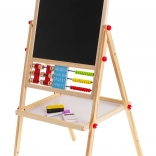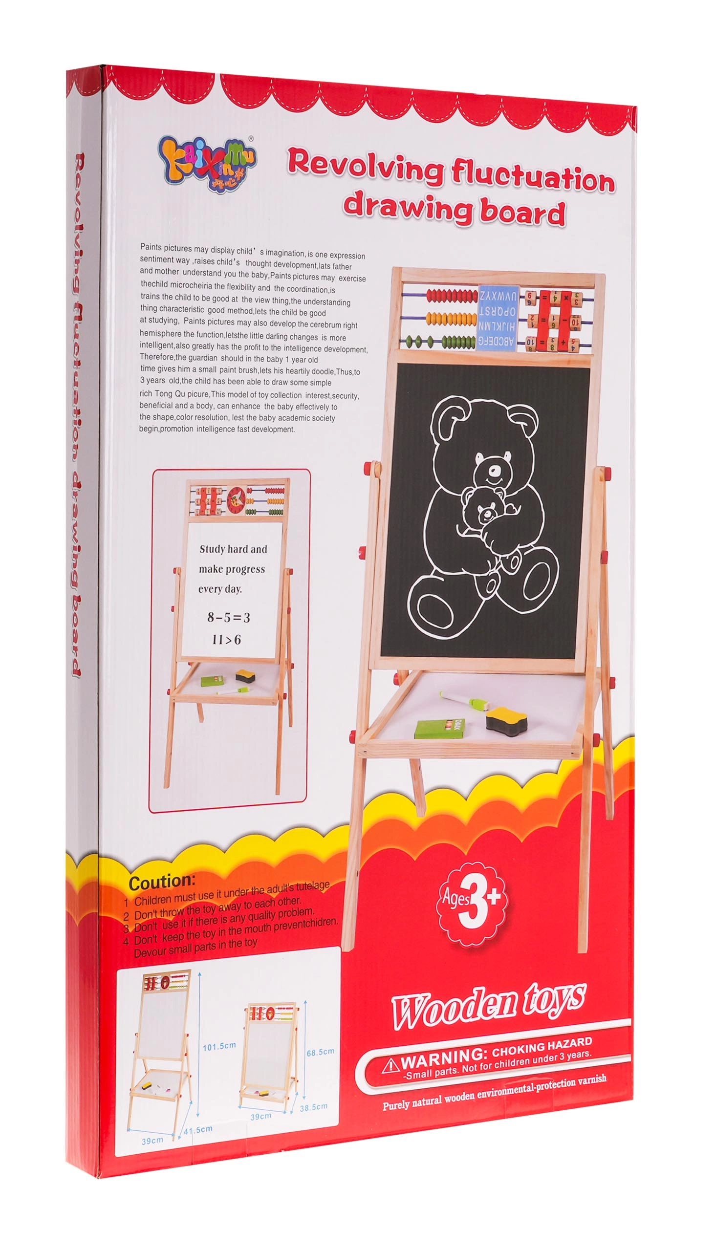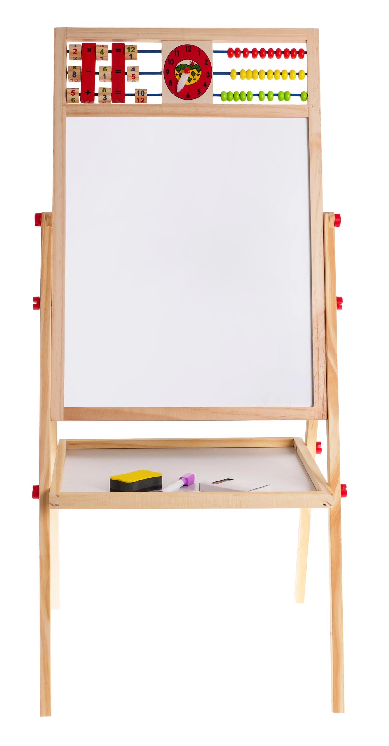 Grand tableau en bois, double face pour les enfants dès 3 ans, offrant une face blanche whiteboard magnétique et une face noire pour la craie. Inclut un abaque, une horloge éducative et un puzzle mathématique, une étagère pratique et une hauteur réglable. Le coffret comprend un feutre avec gomme, des craies de couleur et une éponge – tout pour écrire, dessiner et apprendre en s’amusant.
