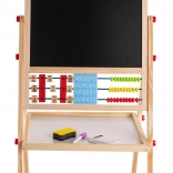 Au-dessus du tableau, vous trouverez un abaque, une horloge éducative avec aiguilles et des éléments mathématiques rotatifs/coulissants pour les premiers calculs. L’étagère de rangement inférieure garde tous les accessoires à portée. Le jeu avec le tableau développe la motricité fine, la concentration, les compétences préscolaires et la fantaisie.
