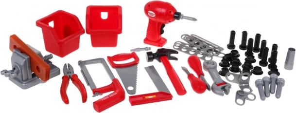 | - atelier, - étau, - tournevis, - marteau, - scie, - scie à métaux, - équerre, - pince, - 2 x tournevis, - clé, - embout de vissage interchangeable, - 4 x cheville, - 8 x vis, - 11 x écrou, - bois à visser, - 8 x pièce rectangulaire à visser, - 2 x boîte à outils. | |