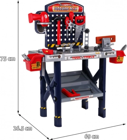 | - atelier env. 69 cm x 26,5 cm x 75 cm, - tournevis env. 13 cm x 15,5 cm, - bacs à outils env. 9,5 cm x 9,5 cm, - emballage env. 53 cm x 37 cm x 13 cm. |