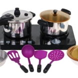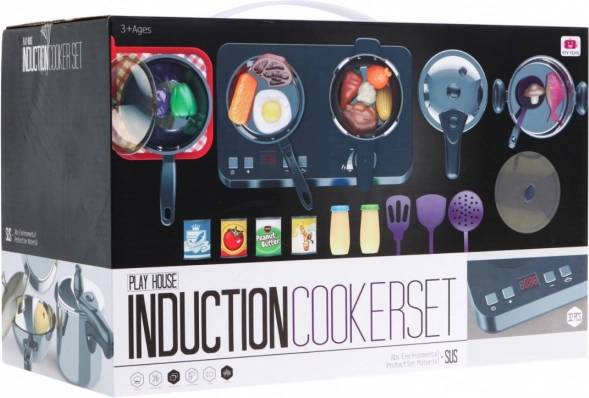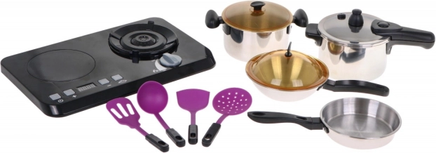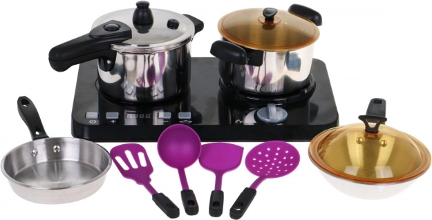 | Un incroyable set de cuisine très bien équipé, composé d’une plaque à induction, de casseroles et d’accessoires de cuisson, est destiné aux enfants à partir de trois ans. La poêle, la casserole et l’autocuiseur ressemblent à de vrais, mais en version miniature. La plaque à induction est alimentée par 3 piles AA 1,5 V (non incluses) et est équipée d’effets sonores et lumineux. À gauche se trouve un brûleur éclairé avec des sons de cuisson et un panneau pour régler la durée de cuisson de 2 à 20 minutes. À droite se trouve un brûleur éclairé avec des sons de friture et un bouton marche/arrêt. Des aliments factices sont également inclus dans l’ensemble. | ||
