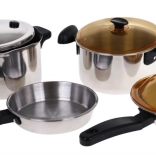 | - plaque à induction env. 33 cm x 20,5 cm x 3 cm, - autocuiseur env. 23 cm x 10 cm x 13 cm, - wok avec couvercle env. 24 cm x 15 cm x 7 cm, - poêle env. 24 cm x 13 cm x 3 cm, - casserole avec couvercle env. 24 cm x 13 cm x 3 cm ; 12 cm x 19 cm x 15 cm, - boîtes : miel, sardines, sauce, beurre de cacahuète env. 5 cm x 5 cm, - spatules, louche, écumoire env. 16 cm x 6 cm, - autres accessoires env. 7 cm x 4 cm, - emballage env. 34 cm x 21 cm x 18 cm. |