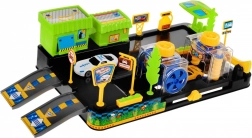 2 petites voitures, grande base, panneaux de signalisation, tapis roulant, chambre avec brosses rotatives, chambre de séchage, barrière mobile, 2 passages inférieurs/rampes, décorations (arbres, jardinières, marché/restaurant, station-service)