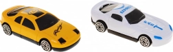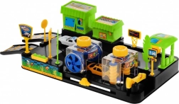 La boîte contient 2 petites voitures, des rampes, des barrières, des panneaux et des décorations, y compris une station-service et un marché/restaurant.