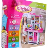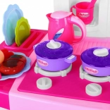 Deux brûleurs avec lumières et sons réalistes de friture et de cuisson, four et réfrigérateur ouvrants, évier avec robinet à partir duquel l’eau coule vraiment.