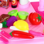Un riche ensemble d’accessoires est inclus : casseroles et poêles avec couvercles, ustensiles, vaisselle, fruits et légumes à velcro pour « couper », viennoiseries et autres compléments. Tout cela favorise le jeu de rôle, la communication et l’apprentissage de l’ordre grâce aux étagères, crochets et à l’égouttoir à assiettes.