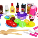 Casseroles, poêle, petite bouilloire, vaisselle, ustensiles, fruits et légumes avec velcro, viennoiseries et autres accessoires. Tout pour un jeu créatif et le développement de la motricité fine.