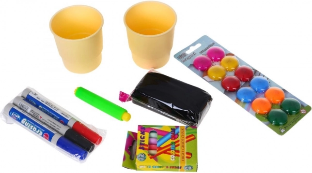 Le pack comprend des gobelets en plastique, un set de feutres, des craies, des aimants et un porte-craie, pour soutenir tous les types d’activités artistiques.