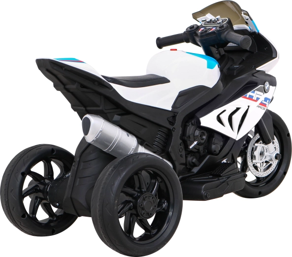 Cette moto électrique pour enfants BMW HP4 de couleur blanche combine un look sportif avec la stabilité sûre de trois roues. Deux moteurs de 2×35 W et une batterie 12 V 4,5 Ah assurent une conduite fluide en marche avant et arrière avec 2 vitesses, tandis que les feux LED avant offrent un effet réaliste et une meilleure visibilité.