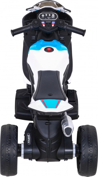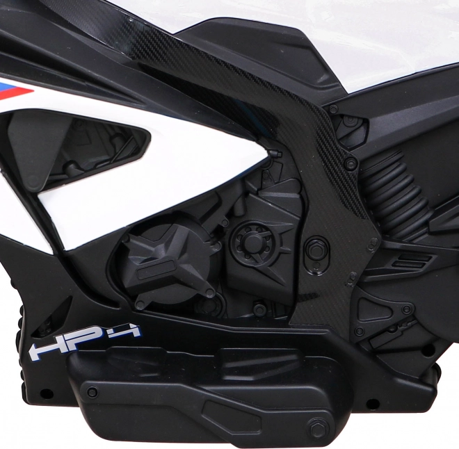 Moto électrique pour enfants BMW HP4, blanche, 3 roues, LED, MP3/USB, selle en éco‑cuir