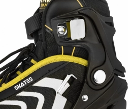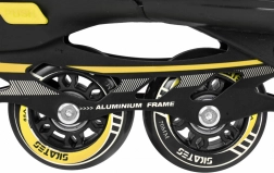 La chaussure bénéficie d’une ventilation efficace, d’une membrane semi-perméable et d’une semelle intérieure profilée en mousse EVA revêtue d’un matériau velours. La triple fermeture (laçage, sangle velcro, boucle sécurisée) maintient le pied de manière stable. Le châssis en aluminium avec roues PU 70×24 mm, dureté 85A, et roulements ABEC-7 offre une conduite fluide et rapide, avec frein sur le patin droit.