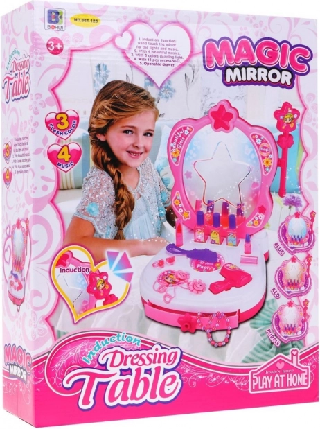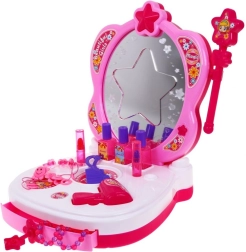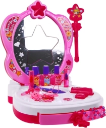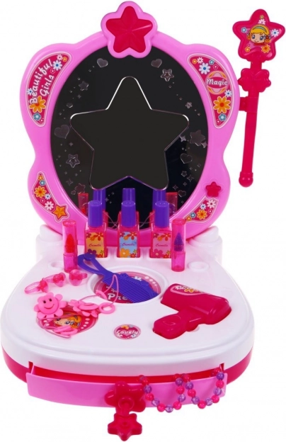 Adorable coiffeuse pour enfants dès 3 ans, avec un miroir étoilé lumineux, une ambiance musicale et un riche ensemble d’accessoires pour un jeu créatif. Avec une baguette magique rose, un sèche-cheveux, des bijoux et une « cosmétique » factice, elle stimule l’imagination et la motricité fine. Alimentation 3× AA (non incluses).
