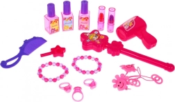 Comprend une baguette magique, un sèche-cheveux, un peigne, une clé pour le tiroir, des flacons et rouges à lèvres factices, des élastiques, des bracelets et des bagues.