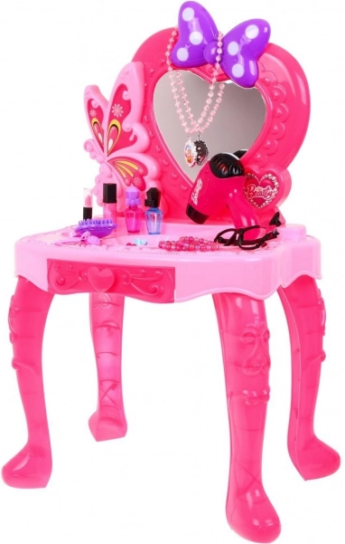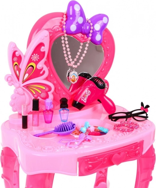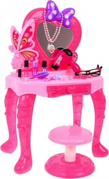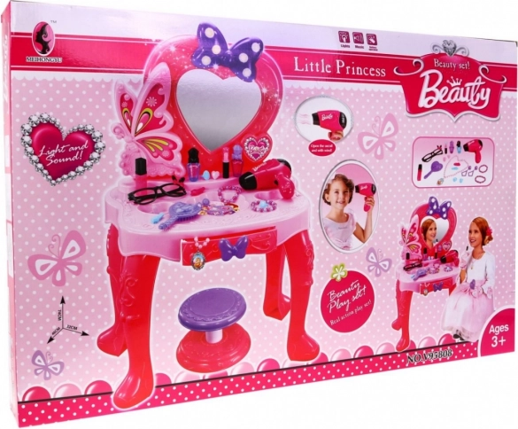 Adorable coiffeuse rose pour petites coquettes offrant des effets lumineux et sonores, un sèche-cheveux interactif avec souffle et un riche ensemble d’accessoires pour un jeu créatif. Avec tiroir ouvrant pour les trésors, table avec miroir stable et tabouret confortable. Idéale dès 3 ans, favorisant l’imagination, le jeu de rôle et la motricité fine.