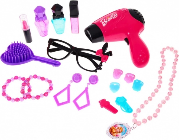 - Coiffeuse, tabouret, sèche-cheveux, lunettes, peigne env. 12 × 7 cm, collier, 2× bracelet, 4× bague env. 2,5 × 2,5 cm, 2× barrette env. 4 × 2 cm, imitation de rouge à lèvres env. 6,5 × 1,5 cm, 3× flacon env. 7,5 × 3 cm, pendentif princesse env. 4 × 3 cm, 2× boucles d’oreilles, autocollants