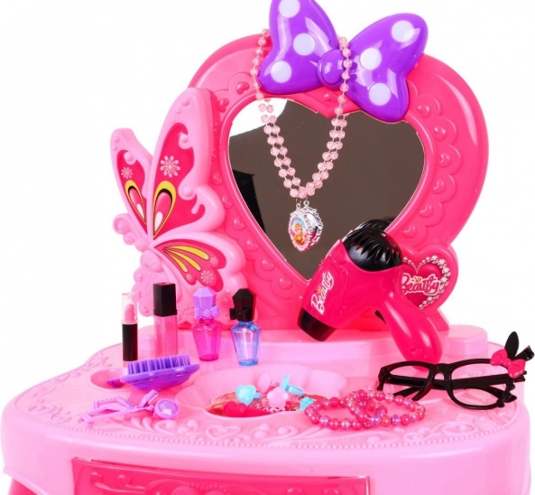 Le nœud au-dessus du miroir en forme de cœur s’illumine et clignote, accompagné d’une mélodie. Les enfants profitent ainsi d’un jeu de salon de beauté réaliste et captivant.