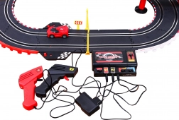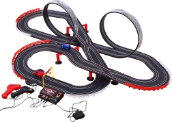 | - 2 voitures de course, - 2 télécommandes, - piste en sections, - barrières, - panneaux de signalisation, - alimentation, | |