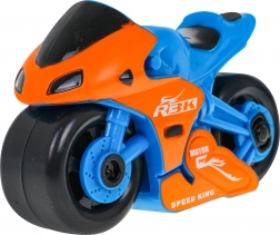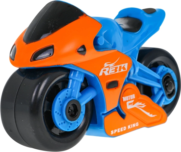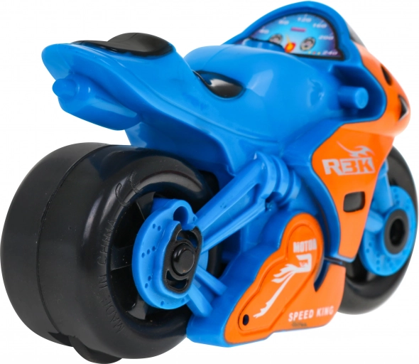 Moto stylée en bleu et orange avec l’inscription « Speed King » pour des jeux de course palpitants.