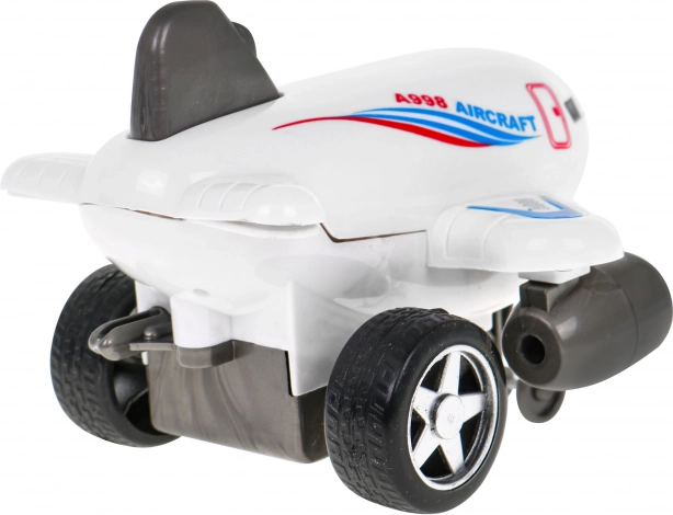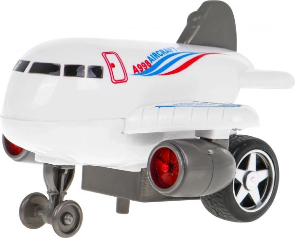 Avion blanc adapté aux enfants, avec un design réaliste et des roues permettant de le faire rouler.