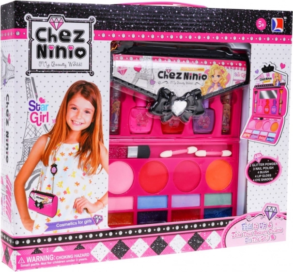 Une fois ouvert, le sac se transforme en mini coiffeuse avec fards, blushs, gloss et vernis rangés de façon claire – prêt pour se maquiller partout.
