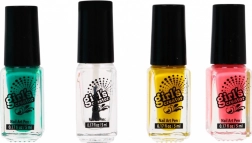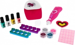 Tout le nécessaire pour le nail art à la maison au même endroit : vernis, décorations, paillettes, séparateurs et lime. Le sèche-ongles pratique réduit l’attente et aide à fixer les décorations.