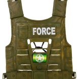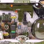 - Gilet à fermeture, masque avec lunettes, casque, fusil avec viseur, jumelles, grenade, montre, sifflet, badge/médaille, talkie-walkie (à piles), boussole, écouteurs, couteau en plastique sécurisé, gamelle, porte-clés