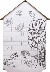 Les parois blanches aux contours noirs de chevaux invitent à colorier avec crayons ou feutres. Les enfants créent un look unique pour leur maisonnette et développent leur imagination.