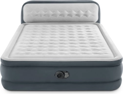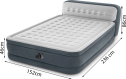 Matelas gonflable INTEX à double paroi avec technologie Dura-Beam Fiber-Tech, offrant une grande surface de couchage, une tête de lit intégrée et une pompe électrique intégrée pour un gonflage et un dégonflage rapides. Hauteur depuis le sol 46 cm et surface en velours doux garantissant confort, stabilité et aspect soigné. La capacité de charge maximale de 272 kg assure un couchage fiable pour deux personnes.