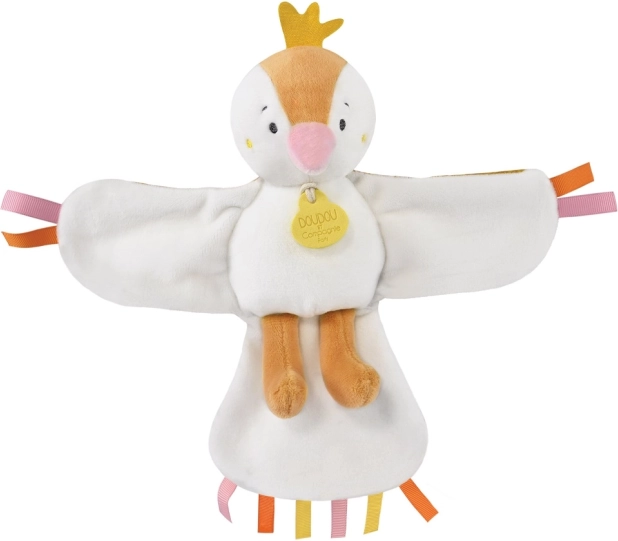 Ce petit oiseau tout doux, dans des nuances de jaune et d’orange, séduit par sa douceur et sa présence sonore apaisante. Les rubans colorés sur les ailes, la queue et la tête invitent à attraper, mordiller et exercer la motricité fine. Sa boîte stylée à motif floral en fait un superbe cadeau pour de jeunes parents.